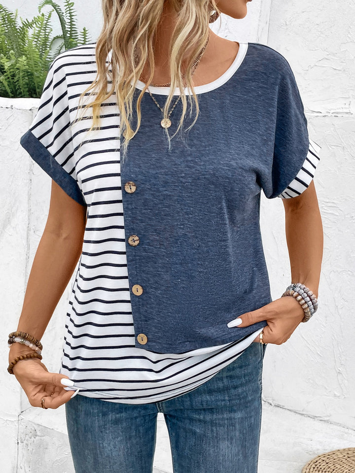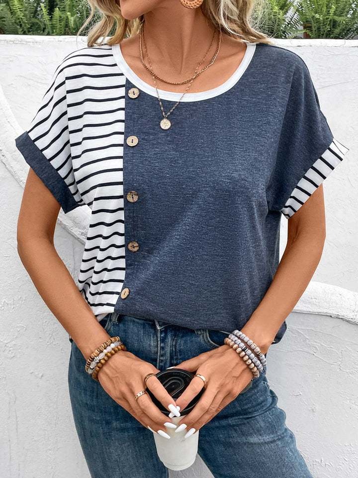 Haut à manches courtes et col rond à rayures et boutons décoratifs