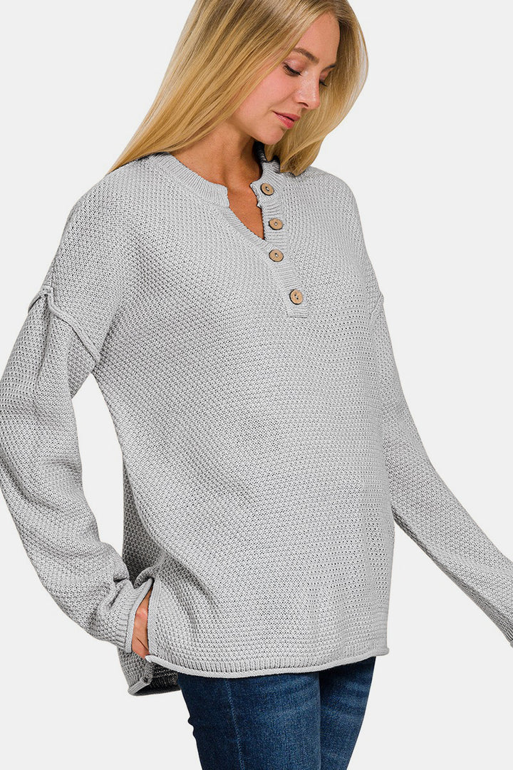Ce pull à épaules tombantes et fermeture à boutons est le complément idéal et confortable à votre garde-robe d'hiver. La conception à épaules tombantes ajoute une coupe décontractée et surdimensionnée pour un confort ultime. Le détail de la fermeture à boutons ajoute une touche élégante et vous permet de personnaliser l'encolure. Fabriqué avec un tissu en tricot doux et chaud, ce pull vous gardera au chaud pendant les journées froides. Associez-le à votre jean préféré pour un look décontracté et sans effort, ou habillez-le avec une jupe et des bottes pour une tenue plus soignée. Avec sa silhouette à épaules tombantes tendance et ses options de style polyvalentes, ce pull est une pièce incontournable pour la saison.