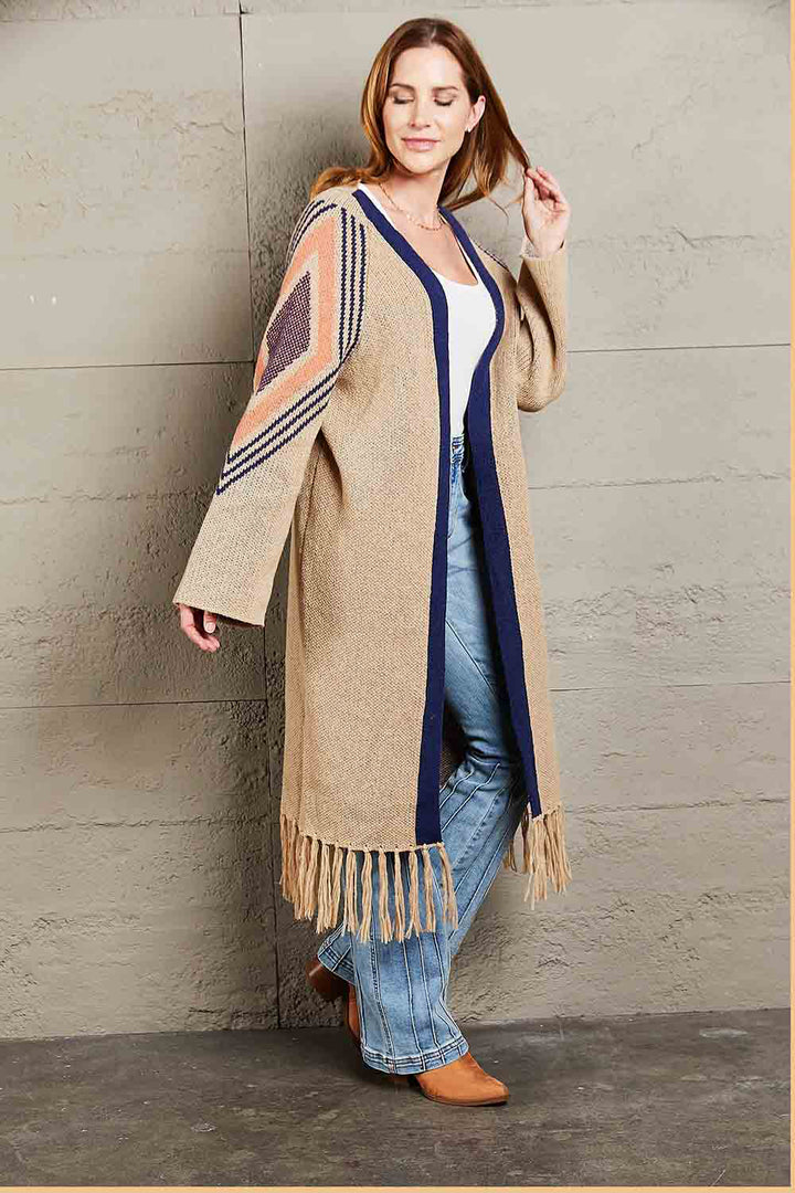Angel Wings Geometric Fringe Hem Open Front Duster Cardigan