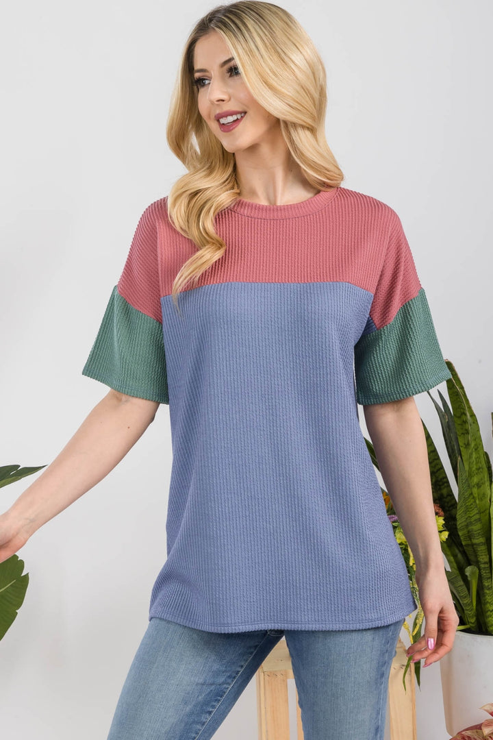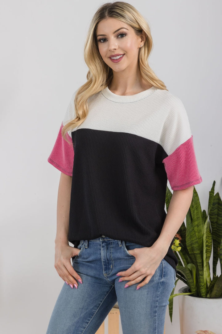 The Ribbed Color Block T-Shirt is a modern and trendy top that features a ribbed texture and contrasting blocks of color for a stylish look. This t-shirt combines two popular design elements to create a unique and eye-catching piece. The ribbed texture adds a subtle detail and dimension to the fabric, while the color-blocking adds a pop of color and visual interest to the overall design. This t-shirt is perfect for adding a contemporary touch to your casual outfits. Pair it with your favorite jeans or shorts for a cool and fashionable ensemble. Whether you prefer a bold and vibrant color combination or a more subtle contrast, the Ribbed Color Block T-Shirt is a versatile and on-trend choice for a casual and effortless style.