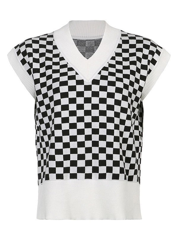 Full Size Checkered V-Neck Cap Sleeve Sweater