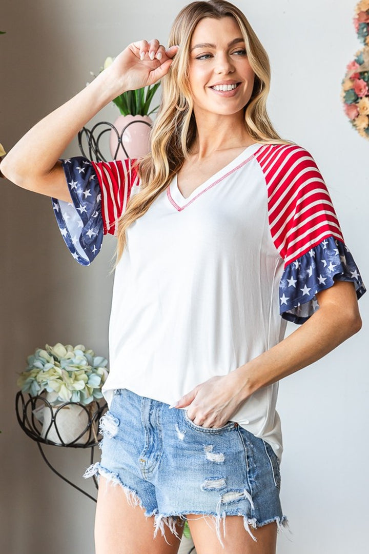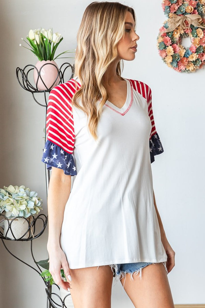 This short sleeve top combines a ruffled V-neck design with a mix of solid, animal, and stripe prints for a trendy and eye-catching look. The stitch detail adds a touch of sophistication to the overall design. Perfect for adding some flair to your everyday outfit, this top is versatile and stylish. Wear it with your favorite jeans for a casual yet chic ensemble. The unique combination of details makes this top a standout piece in your wardrobe. Upgrade your style with this fashionable and fun top today!
