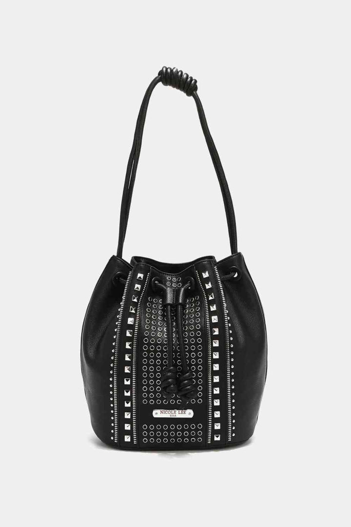 Crafted from high-quality pebbled vegan leather, this stunning silhouette is adorned with exquisite stud and zipper detailing on the front, adding a touch of attitude to your ensemble. The bag features a secure drawstring and snap button closure, ensuring your belongings stay safe and organized. For added durability, metal feet are placed at the base, while the premium print polyester interior lining by Nicole Lee elevates the overall luxury. Stay organized with the back interior zip pocket, complete with a logo nameplate and key ring strap, and conveniently store your smartphone and wallet in the two front interior slip pockets.
