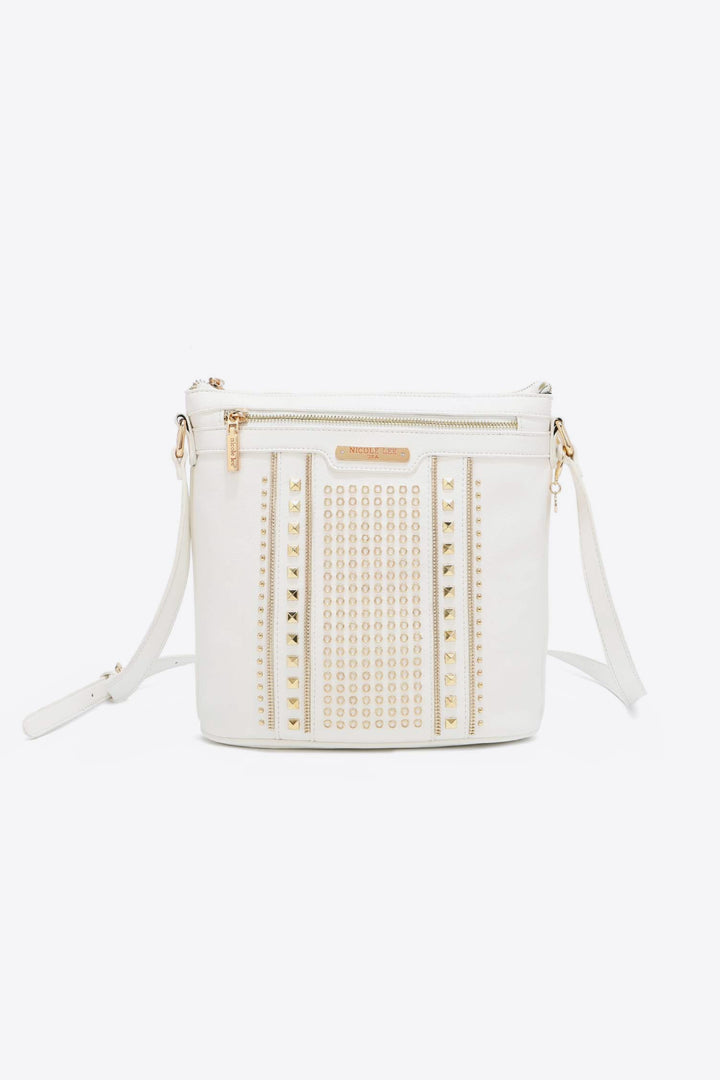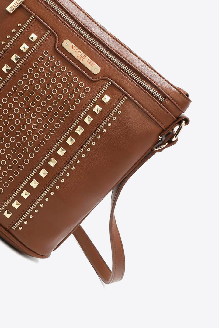 Designed by Nicole Lee, this bag boasts a sleek and modern design that will add a touch of sophistication to any outfit. The bag features an adjustable crossbody strap with a 22"-25" drop, providing you with versatile carrying options. The strap also includes a Nicole Lee authentic circle charm, adding a touch of elegance and style. The bag's zip top closure ensures your belongings remain secure, while the front zip pocket offers easy access to your essentials. The stud and zipper detailing on the front of the bag adds a touch of edginess and character to the design, while the logo engraved nameplate and zipper pulls serve as subtle reminders of the bag's high-quality craftsmanship. The bag's interior is lined with Nicole Lee's premium print polyester lining, providing both durability and a stylish contrast to the pebbled vegan leather exterior. The back interior zip pocket features a logo nameplate and key ring strap, ensuring your keys are always within reach. The two front interior slip pockets provide ample space for storing your smartphone and wallet, keeping your essentials organized and easily accessible.